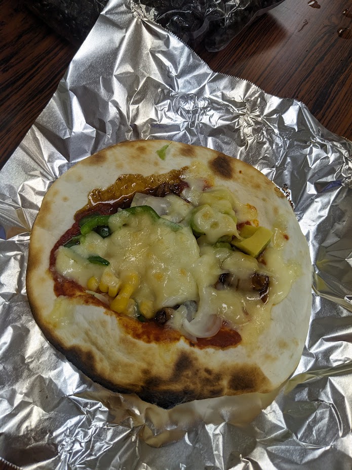 いつもはピザ玉から生地を延ばしているのですが、今回はトルティーヤ生地をピザ生地に転用。手軽にピザが楽しめて人気でした。
