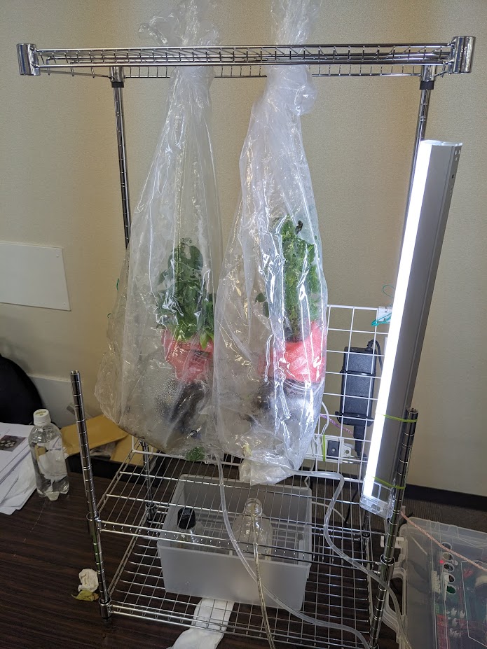 秘密結社オープンフォースの宇宙農業デモ。袋の中はバジルとミントです。このあと懇親会の具材にしてみんなでおいしくいただきました。